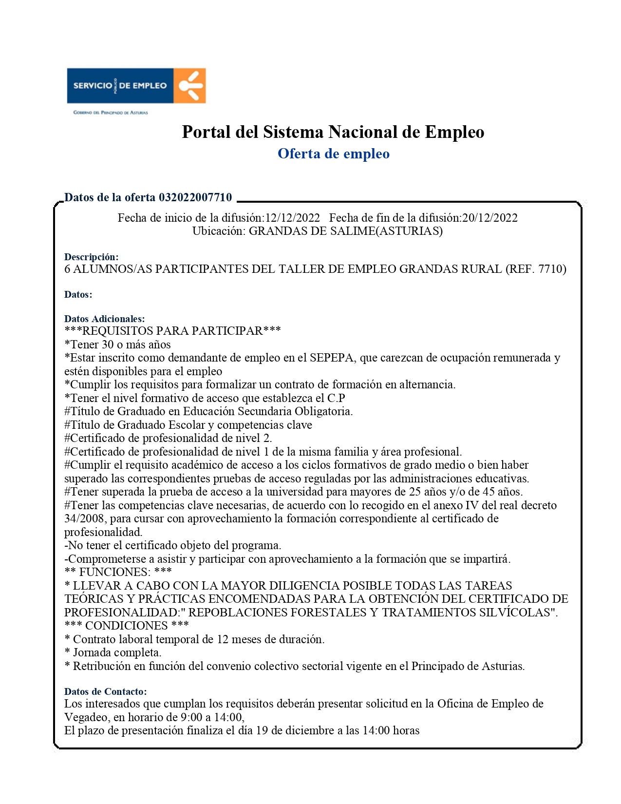 El plazo de presentación finaliza el día 19 de diciembre a las 14:00 horas. Las personas interesadas deben ponerse en contacto con la oficina de empleo de Vegado.