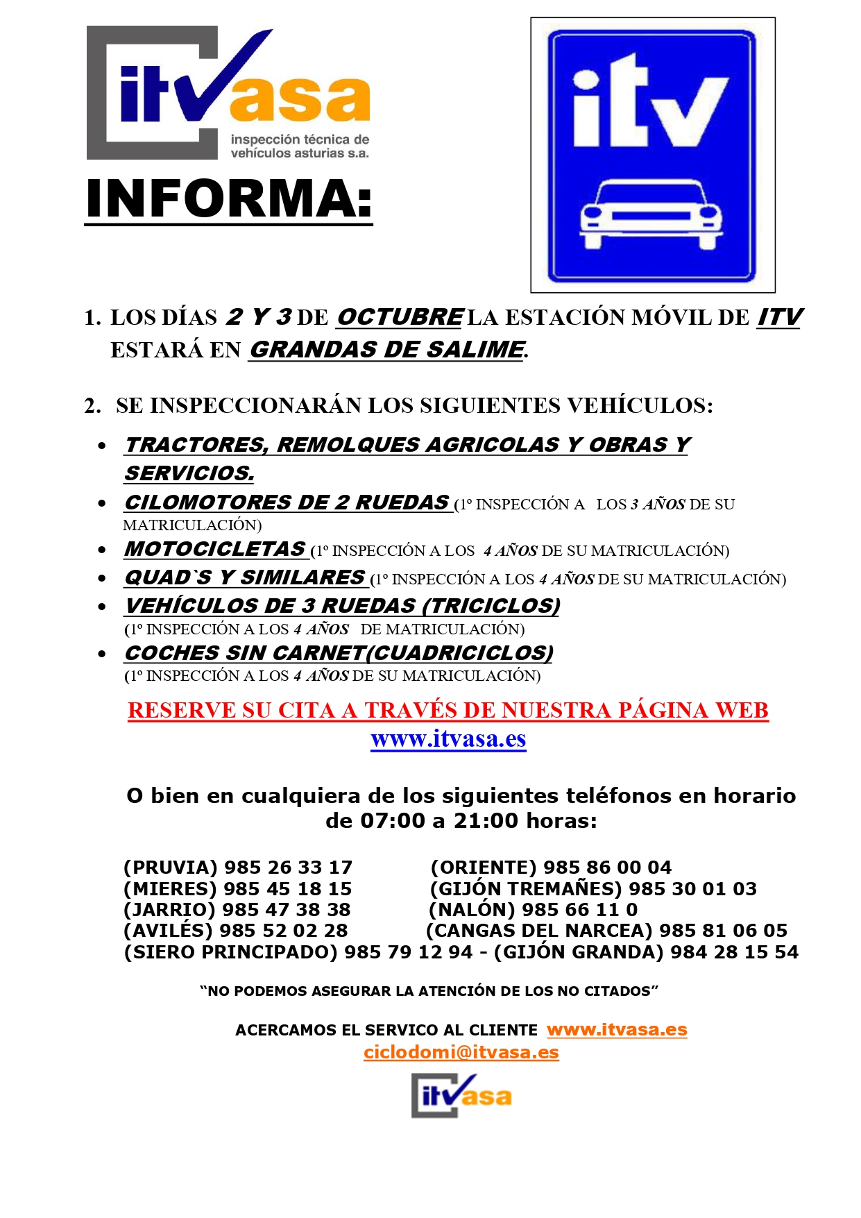 Los días 0 y 03 de octubre se desplazará a Grandas de Salime la estación móvil de ITV para motocicletas, ciclomotores, tractores, coches sin carnet y vehículos especiales.