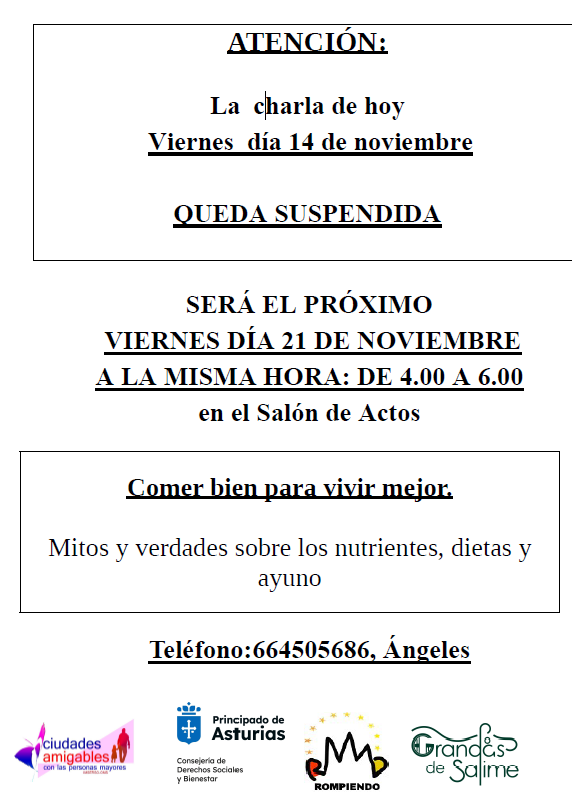 14/11/2025Suspendida la charla Vivir bien para comer mejor del viernes 14
